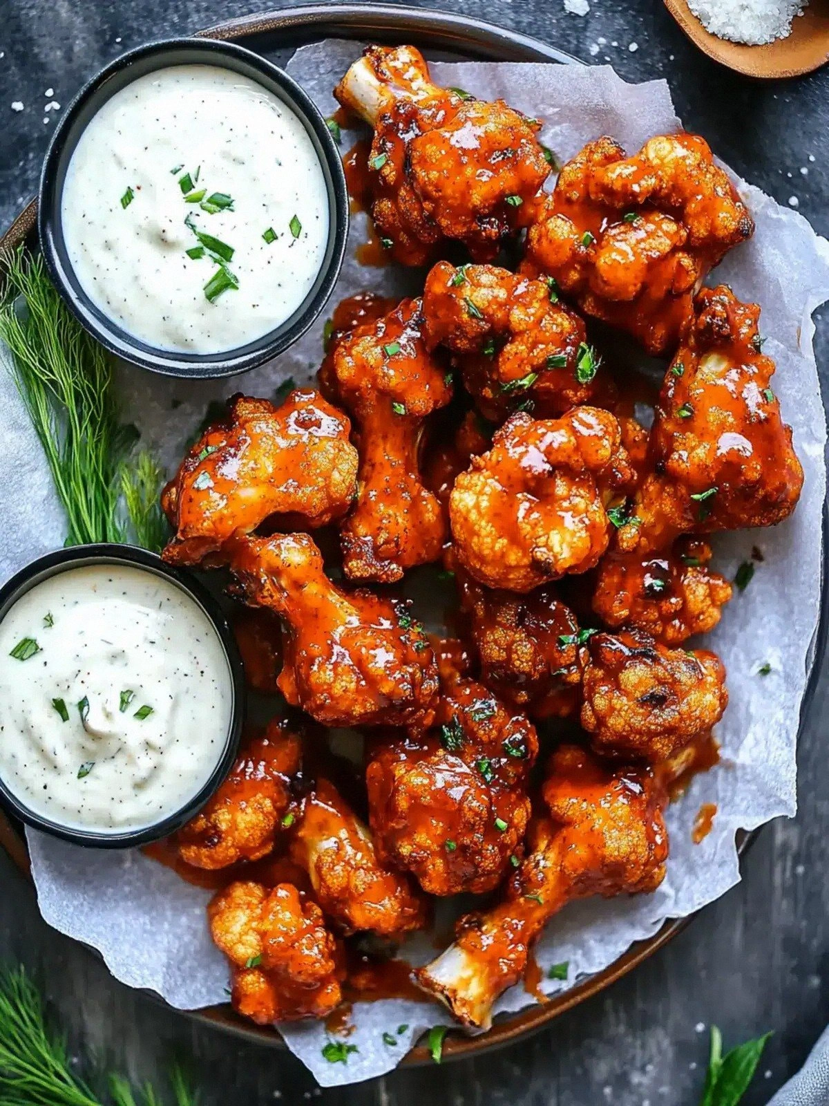 Vegan mayonnaise adds creaminess and helps bind the sauce to the wings, creating a cohesive flavor profile. Dried dill and parsley provide herbal notes that cut through the heat, adding a fresh dimension. Together, these ingredients create a balanced dip that cools the palate after each spicy bite.