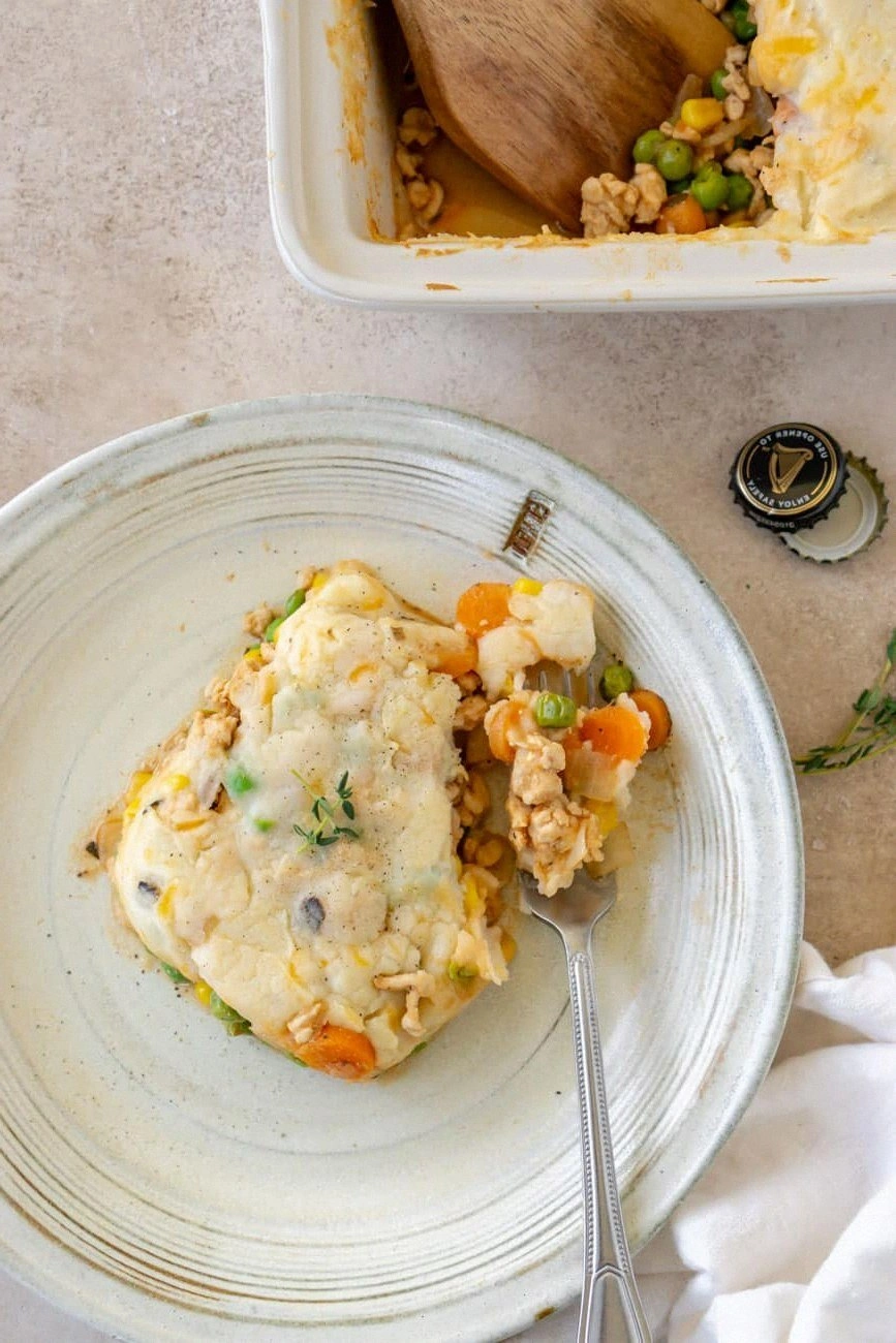 Stir a handful of cranberry sauce into the turkey mixture for a sweet‑savory holiday flavor. Top with a layer of mashed potatoes and a sprinkle of chopped pecans before baking. The cranberry adds a tart contrast that pairs beautifully with the rich gravy.