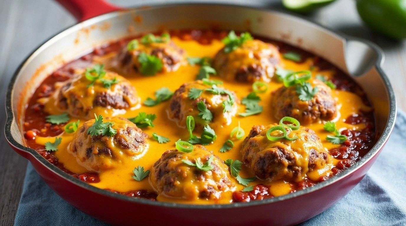 - Remove the meatballs from the oven and transfer them to a large bowl. Pour the warm sauce over the meatballs, tossing gently to coat each one evenly. Sprinkle the shredded Mexican blend cheese on top and return the bowl to the oven for an additional 5 minutes, or until the cheese is melted and bubbly. Serve hot, garnished with fresh cilantro and a squeeze of lime if desired.